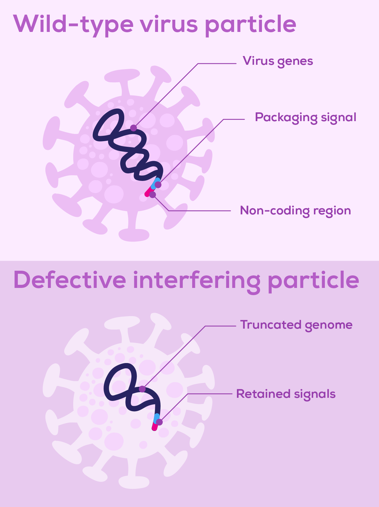 Defective interfering particles (DIPs) are virus particles consisting of a defective viral genome (DVG) packaged in a normal viral particle (Figure 1). These defective viral genomes arise spontaneously due to replication errors deleting, rearranging or mutating the virus’ genetic material. Such genetic alterations make DVGs unable to replicate by themselves. However, if the DVG genome retains the signals that initiate replication and enable packaging, DVGs can be replicated and assembled into viral particles in cells coinfected with wild-type virus, which supplies the missing proteins and functions1,2. Some DVGs are faster to replicate than the wild-type viral genome, competing for viral replication and encapsidation machinery and outproducing wild-type virus particles3. It is this interference of wild-type virus replication by defective particles that gives DIPs their name.