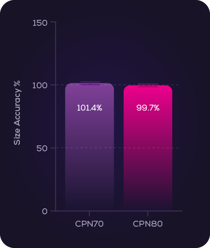 The precision and consistency of solid-state nanopores enable incredibly accurate measurement of small particles from 40 nm and above, with smaller size ranges currently in development. Size accuracy is exceptionally high, as demonstrated by the 99.7% agreement with TEM shown below. Rapid single-particle analysis ensures the Pulsoid maintains accuracy even when analysing polydisperse samples.