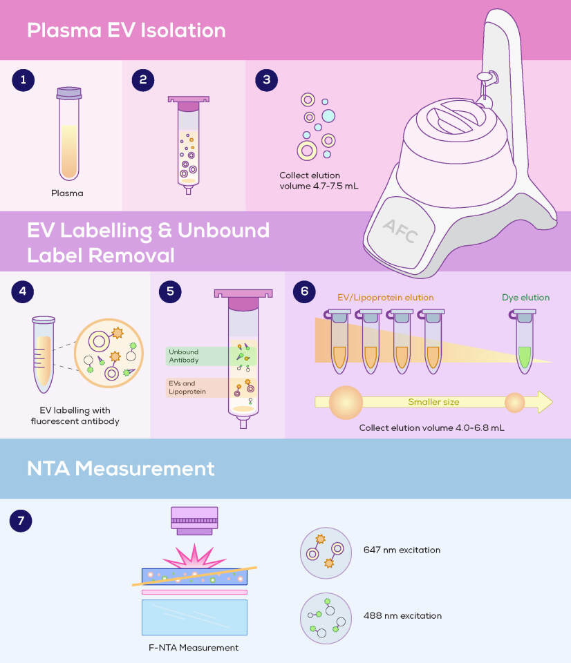 The group saw an opportunity to reduce F-NTA’s background noise and improve specificity, and incorporated qEV Isolation into the workflow. The use of qEV1 70 nm columns and the Automatic Fraction Collector allowed consistent portions of the sample to be collected at different stages; first to collect purified EVs, and later (using the same qEV column) to separate unbound labels (Figure 1).